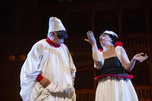“Vi fa molto ridere questa mia poesia? – dice l’Attore al pubblico che si sbellica – Ci ho messo cinque anni per scriverla!” Qui sta la chiave di questo spettacolo, da qui il titolo: Non c’è niente d ridere. Uno spettacolo al contrario che incuriosisce, sorprende e diverte, fin dalla prima scena. Anche la scenografia raffigura un teatro visto dal punto di vista degli attori, con il sipario, le quinte, da dentro, con i palchetti accesi come fondale e le luci della ribalta accese contro di noi. In questo spazio irreale si avvicendano un Attore e un’Attrice (Peppe Barra e Lalla Esposito). Macchiette, canzoni, monologhi del vecchio Varietà e surreali parodie del teatro classico napoletano, rappresentano le situazioni drammatiche della coppia teatrale, fino all’inatteso finale pulcinellesco, di comica e malinconica poesia. L’Attore veste il panni di Pulcinella morto che scende in terra per vedere che fine ha fatto la sua Colombina, che invece ritrova furiosa perché si credeva abbandonata. Piano piano, sull’onda dei ricordi, sommersi dalla nostalgia di un’epoca perduta, che non tornerà mai più, tre bisticci, dolci parole d’amore e duetti, si abbracciano per andarsene insieme in Paradiso. Uno spettacolo dal ritmo incalzante, per i continui cambi di scena, di luce, di costume, di linguaggio, uno spettacolo d’Attore, come si diceva un tempo, sostenuto e arricchito dalle musiche dal vivo. Peppe Barra e Lamberto Lambertini, di nuovo insieme, vogliono offrire al pubblico uno spettacolo che, con lo stesso spirito di quel Teatro che insieme con l’indimenticata Concetta Barra, riuscì, per dodici anni, in Italia e nel mondo, a coniugare l’applauso del pubblico con l’esultanza della critica, la risata con la commozione, la leggerezza con la cultura, la raffinatezza con la volgarità. Oggi più che mai, dopo tanti mesi oscuri e difficili, pubblico desidera divertirsi, soprattutto nel senso di essere trascinato fuori dal tempo e dalla realtà, perché il vero teatro, si sa, è sempre più bello della vita vera, perché sul palcoscenico persino la morte è per finta.