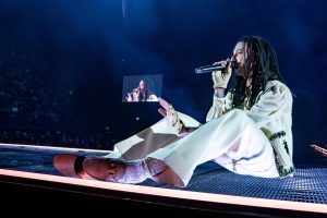 Uno show internazionale quello che Ghali ha portato sul palco dell’Unipol Forum di Milano per la partenza del nuovo tour nei palasport GHALI – LIVE 2024: un progetto sfidante e una macchina produttiva monumentale (guidata dal Direttore Creativo Simone Ferrari per Balich Wonder Studio) che guarda fuori dall’Italia per giocare un campionato live tutto suo, di caratura global ed altissimo livello, accompagnando il pubblico in un viaggio in 30 brani nella storia musicale e nel vissuto di Ghali e portando il deserto all’interno dei palasport, con tanto di vere dune che l’artista percorre e plasma intorno a sé, calando lo spettatore in una dimensione immaginifica. Dal surrealismo al realismo, dai toni sognanti a quelli più crudi: GHALI – LIVE 2024 è mélange di colori e sfumature, fusione di mondi diversi che vivono su uno stesso palco, riflettendo le mille anime di Ghali. Come tanti capitoli di un unico diario, nello show si alternano trascinanti momenti pop, attimi di pura magia, quando un’imponente cascata di sabbia precipita su Ghali sulle note di Wily Wily; squarci dark con forti prese di posizione -su tutti Ora d’aria, con una tempesta di vento che si abbatte sul podio dove Ghali tiene il suo comizio; un blocco urban per raccontare l’oggi con una prospettiva più trap, ospitando sul palco Lazza, Simba La Rue, Tony Effe, Pyrex e Astro; e momenti di festa con la hit multiplatino Good Times -ma tutti sotto il comune denominatore dell’eleganza e della contemporaneità. Sul finale anche spazio per due toccanti momenti di riflessione e raccoglimento, prima con Bayna (un quadro realisticamente crudo e drammatico, con il racconto per immagini dei soccorsi alle persone in movimento in mare aperto alle spalle di Ghali, che scende nel parterre per terminare l’esibizione in mezzo al pubblico) e poi con l’ultimo singolo Niente Panico a chiudere lo show, lanciando il suo messaggio di forza e resilienza in una dimensione intima ed essenziale. Prodotto da Vivo Concerti, GHALI – LIVE 2024 è uno spettacolo largo, che abbraccia il pubblico transgenerazionale di Ghali nella sua totalità. Per decodificare le diverse parti dello show, in soccorso allo spettatore arriva provvidenziale sul palco a più riprese l’extraterrestre Rich Ciolino, conquistando la scena con i suoi modi fanciulleschi e buffi fino a raggiungere Ghali sulla sanremese Casa Mia.